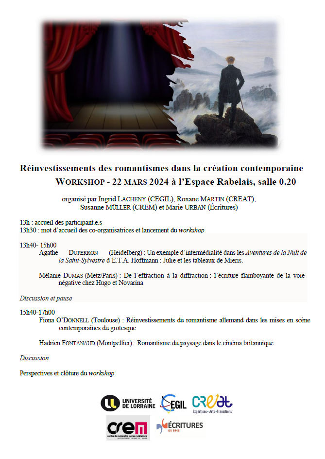 Réinvestissements des romantismes dans la création contemporaine, Journée d’études des doctorants, organisée par Ingrid Lacheny (CEGIL), Roxane Martin (CREAT), Susanne Müller (CREM), Marie Urban (Écritures)